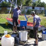 dann musste auch noch das letzte projekt dran glauben. chrisi hatte nämlich eine mobile brauanlage mitgenommen und so machten wir es uns neben dem hafen bequem und brauten 45 liter rügen-bier. es war einfach nur schön und toll und sowieso. vielleicht überreden wir die schweizer regierung, dass sie rügen überfallen soll und ein bisschen näher an die schweiz rückt. dann könnten wir immer in einer so schönen umgebung brauen. was nicht heissen soll, dass wir die garage nicht lieben. aber ein meeresstrand ist schon was anderes als der olle rhein.
