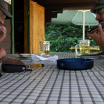 ein höhepunkt der höhepunkte stand am nächsten tag auf dem programm mit einem besuch in leipzig und den 2 liebsten leipzigern. natürlich wurde wieder gegrillt und chrisi liess die runde von mittlerweile 10 personen unser selbstgerautes probieren. dank marek konnten wir sogar noch eine (allerdings autonom operierende) brauage-filiale eröffnen, denn er will noch dieses jahr ein eigenes bier brauen. bewaffnet mit kübeln voll spreewaldgurken und ossi-artikeln machten wir uns am nächsten tag auf den weg in die alten bundesländer. obwohl diese bezeichnung ansichtssache ist, denn aus der sicht der ostdeutschen sind ihre bundesländer die alten. auf jeden fall wollten wir kaja, den türken aus dem frankenland, besuchen. leider war er nicht anwesend, aber da die stammkunden erwartungsgemäss noch dieselben waren wie einen monat zuvor, waren wir nie allein.